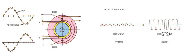 如圖2顯示,當(dāng)轉(zhuǎn)子旋轉(zhuǎn)時便感應(yīng)出溝形高次諧波重迭波形的電壓。各線圈的相位差是180度時,在軸承正常工作時,基波為零,在屏蔽泵軸承檢測線圈輸出端只顯示溝形高次諧波的A、B線圈諧波之差。該溝形高次諧波,在軸承磨損后間隙a大,間隙b小時,B線圈的溝形高次諧波增加。